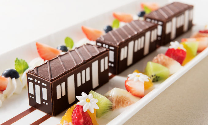 トレインビュープラン「阪急電車といっしょ」には、3両編成の阪急電車型のチョコレートケーキが用意されています。