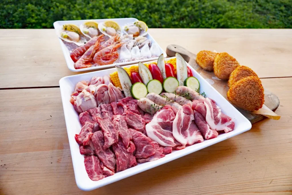 お店では、お肉や野菜の盛り合わせが販売されていて、道具・食材の準備は不要で手ぶらでお出かけいただけます。
