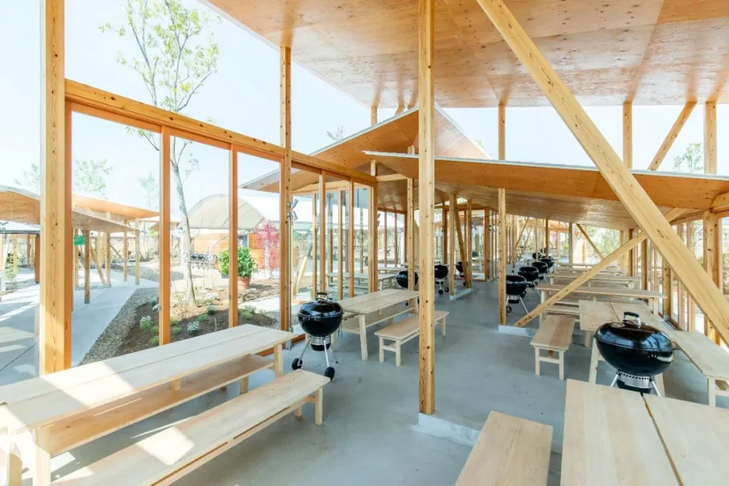 その想いは施設のレイアウトにも反映されていて、 matoiでは広場を中心にぐるりとバーベキューサイトが並びます。サイトは、「屋内席」と「屋外席」の2種類があっていずれも屋根付き。 「屋内席」 の壁一面はガラス張りになっているので、室内にいながらも解放感があって自然の景色を楽しめます。また「屋外席」は、屋根の天井が高いので、時より心地の良い風がすーっと通り抜けます。どちらも公園の景色を身近に感じながらリフレッシュできる設計になっています。
