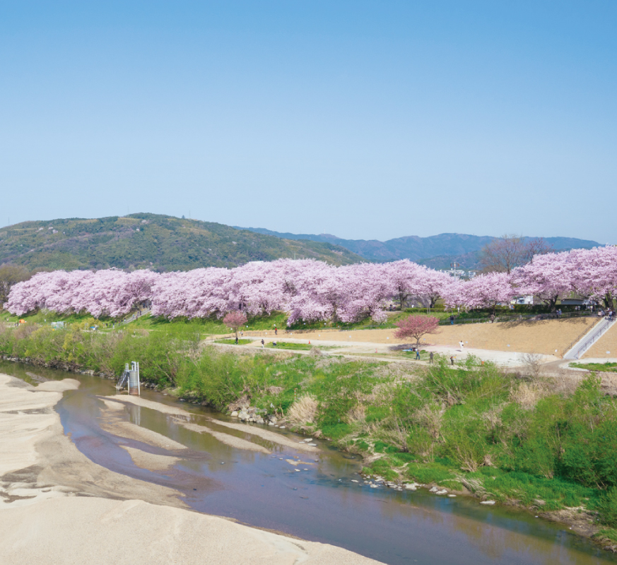 「モトイバ」の名で知られる桜名所の一つ。全長約5キロメートルにわたって続くソメイヨシノなど約1,100本の並木がピンク色に染まり、穏やかな春の風景が広がる。様々な催しが行われる「市民さくらまつり」も必見。