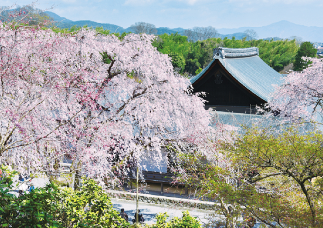 足利尊氏が建立した天龍寺。多宝殿の前の枝垂れ桜の大木が目を楽しませてくれます。春の嵐山を見渡せる望京の丘など、遠近の桜が美しいスポット。
