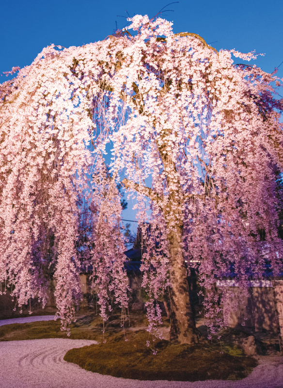 方丈前庭・波心庭の白砂にかかる枝垂れ桜は見事の一言に尽きます。枝の落ち方まで計算されたかのように感じるほど、手入れの技が光る一木特別拝観期間には、方丈前庭の設えとシダレザクラの競演を鑑賞できます。
