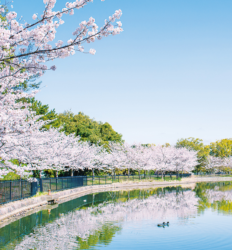 大阪最大級の広さを誇る公園。地元のみならず、遠方からも多くの人が花見に訪れる。広場や池の周りなど、至る所にソメイヨシノが点在し、桜のほかにも春の花々が見られる。