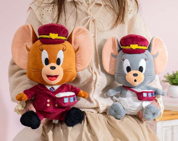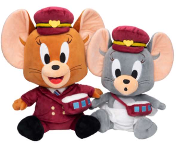 “トムとジェリー”の添乗ぬいぐるみは、お揃いの制服を着て仲良く座っているように見えながら、ハンマーを持つジェリーがトムにいたずらをする機会をうかがっている、というトムとジェリーらしさを表現!