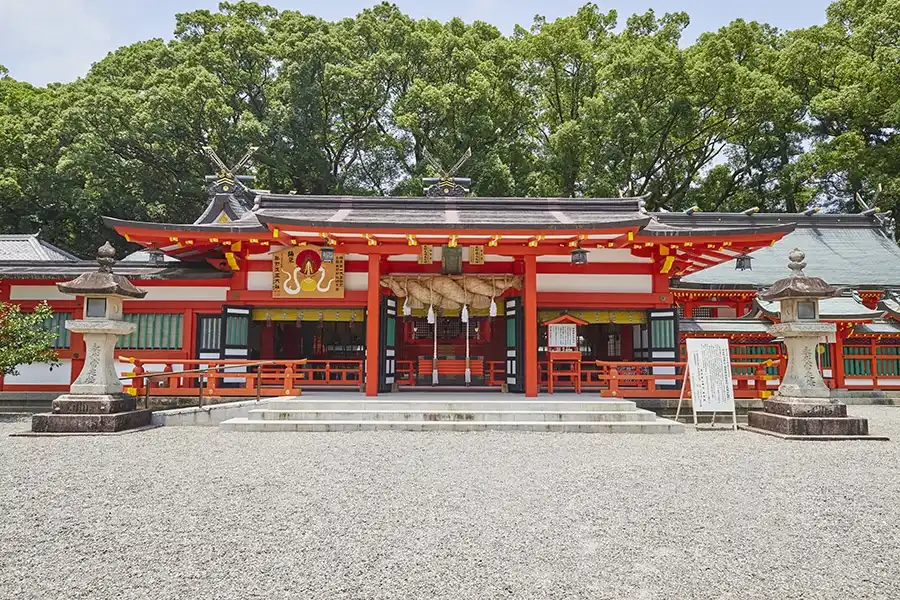 熊野三山のひとつ、「熊野速玉大社」。朱塗りの社殿は、鎮守の森の緑に映え、訪れる人をやさしく迎えてくれます。熊野の神々が最初に降り立ったとされる御神体・霊石「ゴトビキ岩」から、この地の信仰は始まったと伝えられています。