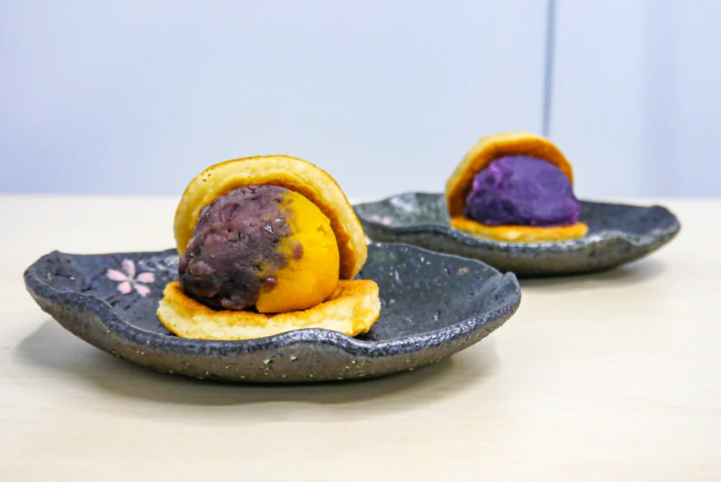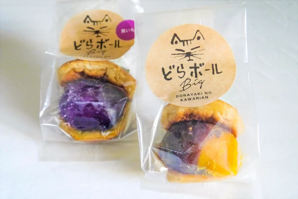 大阪・門真市の住宅街にある「花かんざし」は、小さな和菓子工房。実店舗は持たず、手作りでどら焼きなどを製造しているお店です。そんな「花かんざし」からは、あんこがこんもりたっぷり入ったどら焼き「どらボール」が登場。どら焼きだけど、ぶ厚めの皮の間にはボール状のあんこ!今回は、この個性的などら焼きの季節限定のあんこ2種類をいただきます。