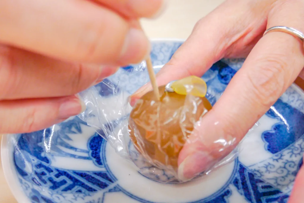ー お手元に一つとって開けて、中の丸い玉を爪楊枝でプチっと刺してください、剥がれますので。