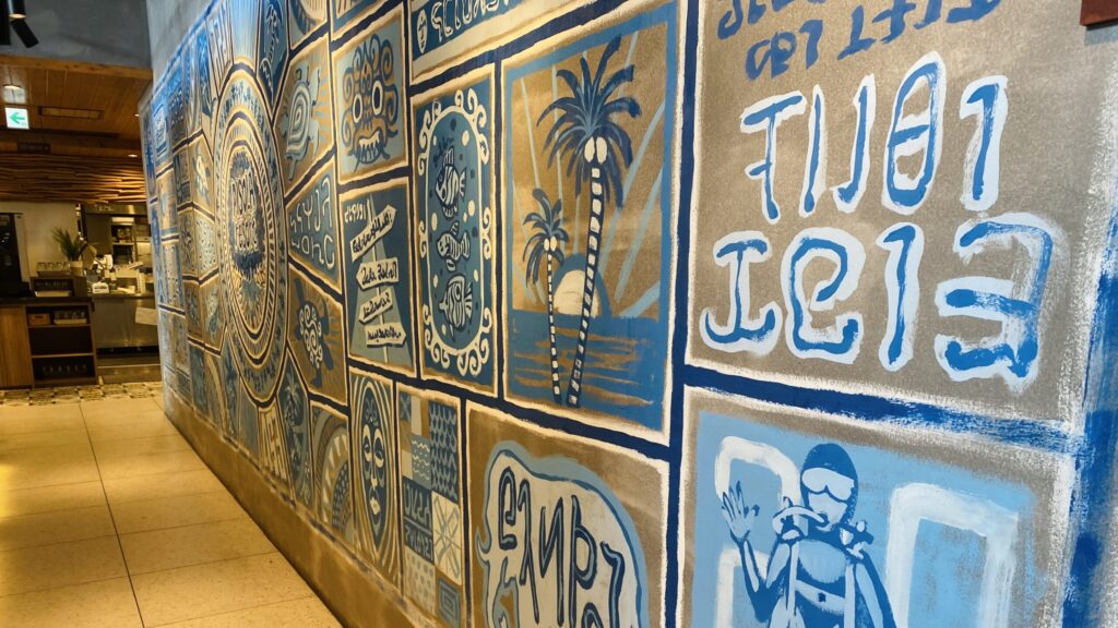 ホームページからの事前予約で待ち時間無し、スムーズに席に案内してもらえました。お店のコンセプトでもある“南国リゾート”が忠実に再現されており、席に案内されるまでの店内の拘りある装飾の数々や壁画などのアートにワクワク感を煽られ、半個室の席に到着。(半個室ではないお席もあります。)