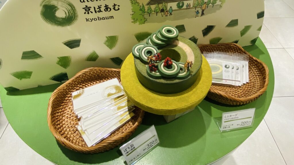 ソフトクリームの価格は税込420円と手頃で、他に「京ばあむソフト」など贅沢メニューも。お土産には京ばあむのほか、サブレやショコラ、ラングドシャ「京茶の葉あわせ」、京ばあむデザインのポチ袋やミニカードなどの小物も揃い、ちょっとした京都土産にもぴったりです。