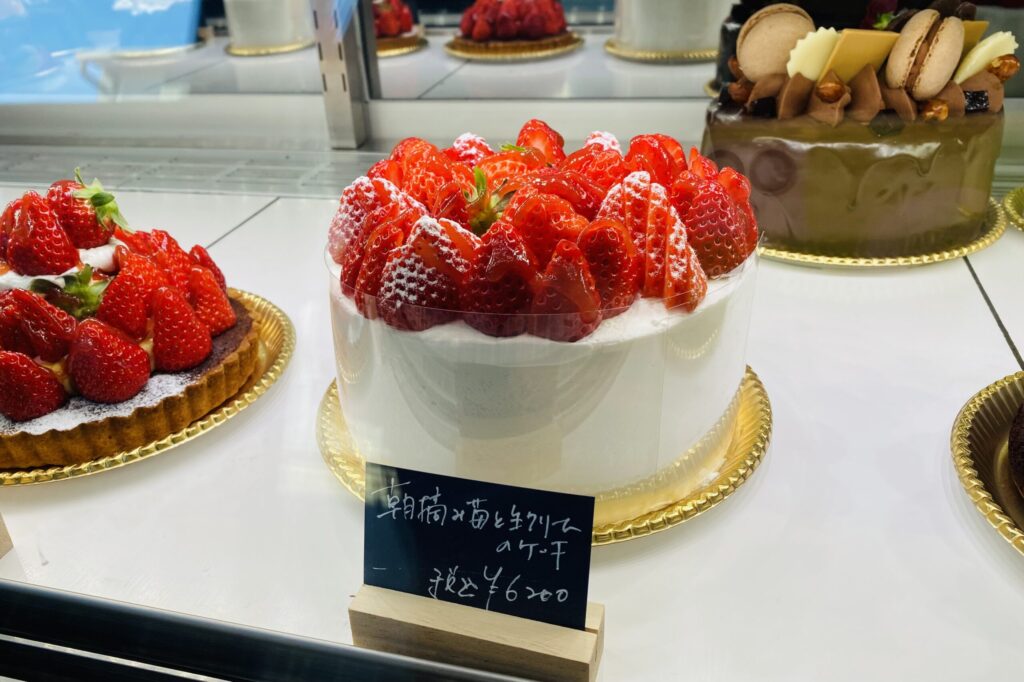 ショーケースには、他では見たことがないイチゴが溢れんばかりに贅沢に盛り付けられた可愛いホールケーキも飾られていました。イチゴ好きの方におすすめです!