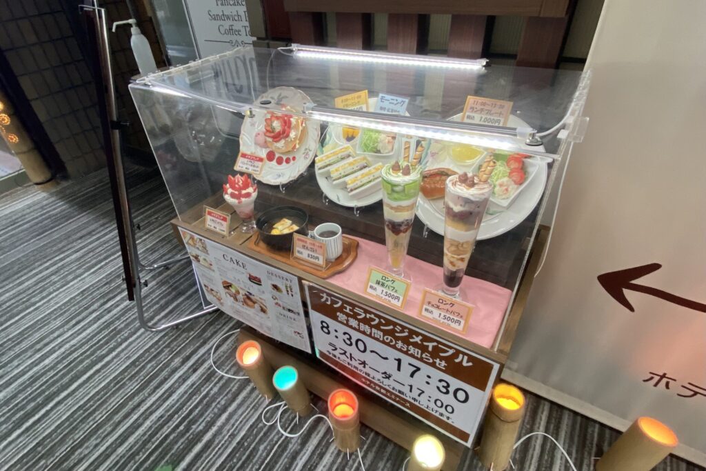 ロング抹茶パフェやロングチョコレートパフェのサンプルも並び、その迫力に気分は一気に喫茶タイムモード。モーニングセットやランチプレート、ぜんざい、パンケーキセットなど、どこか懐かしくて心をくすぐるメニューが揃っています。