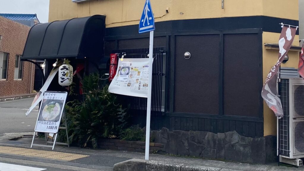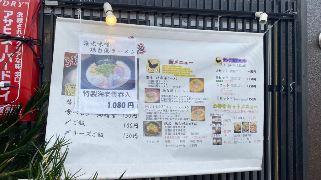 店頭で目を引くのは、 海老味噌鶏白湯ラーメンの案内。お店の顔として大切にされている様子が伝わってきます。