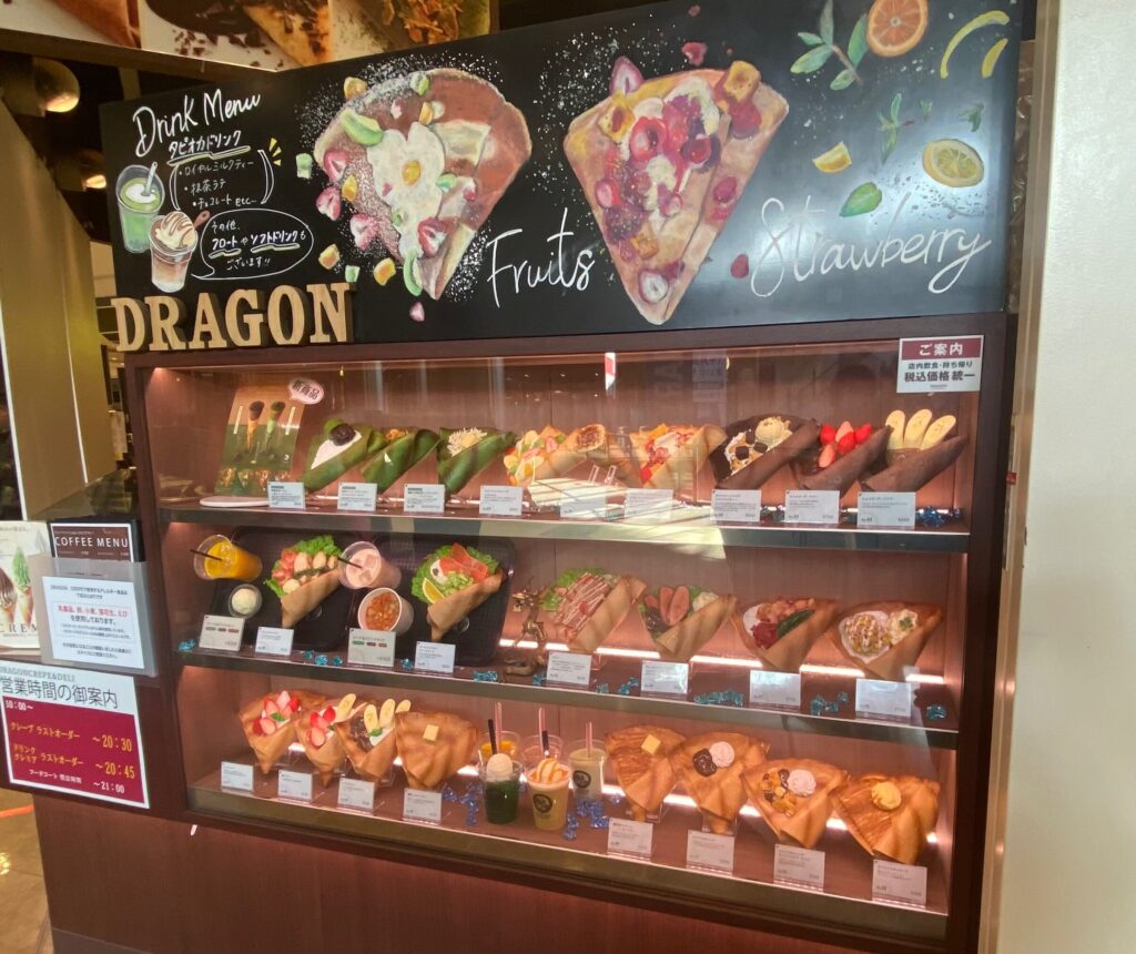 「DRAGON CREPE&DELI イオンモール京都桂川店」は、全国にわずか2店舗しかない希少なクレープショップ。兵庫県に1店舗、そして京都ではイオンモール京都桂川に展開しています。阪急洛西口駅からも徒歩5分という便利な立地で、ショッピングや映画の合間に立ち寄りやすい一軒です。