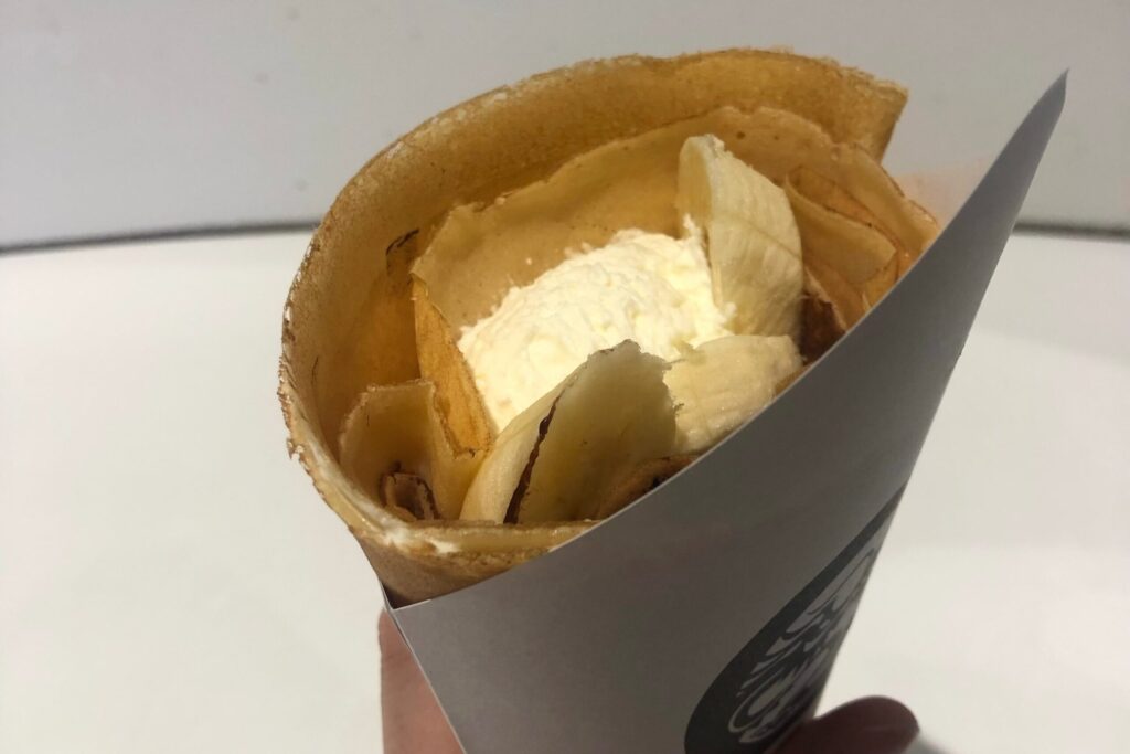 甘いクレープからおかず系まで種類は豊富。その日の気分で選べる楽しさがあります。今回は定番のバナナチョコのクレープを試してみました。ひと口頬張ると、ほわほわのクリームが程よい甘さで広がります。軽やかな口当たりで胸焼けしないのも嬉しいところ。王道の組み合わせだからこそ、ごまかしがきかない。その潔さに思わずうなずいてしまいました。
