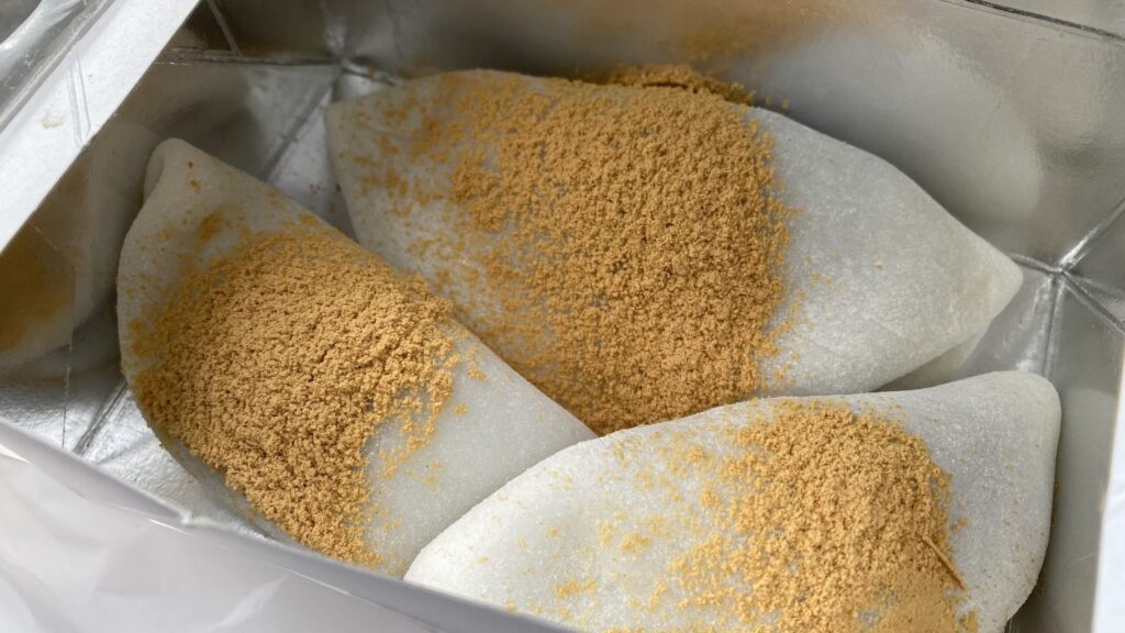 麦代餅の上にまぶされたきな粉も、また絶妙な味わい。砂糖が加えられていないのか純粋なきな粉の味が、お餅の優しい味と相まって、さらに深い美味しさを引き立てていました。素材そのものの味を大切にした、中村軒の和菓子作りへのこだわりが感じられます。