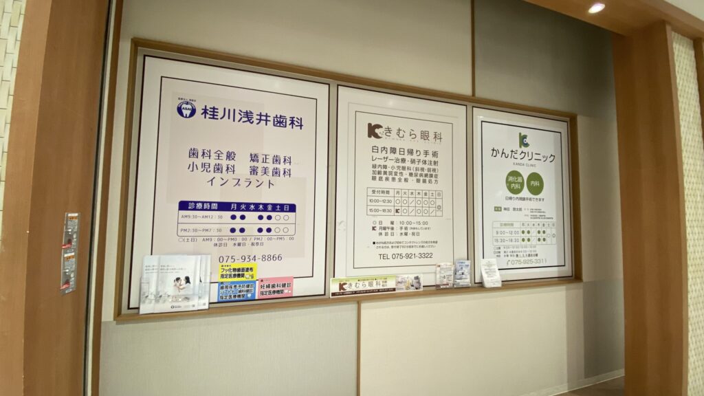 イオンモール京都桂川の中には、まるで小さな総合病院のように利用できる「メディカルモール」があります。歯科・眼科・内科・鍼灸院・小児科・婦人科の6つのクリニックが揃っていて、体のことを幅広く相談できる、とても頼もしい存在です。「浅井歯科」「きむら眼科」「かんだクリニック」「明治国際医療大学 京都桂川鍼灸院 mythos361」「かつらがわキッズクリニック」「アキコ婦人科クリニック京都桂川」と、専門の先生がそれぞれ丁寧に対応してくださいます。