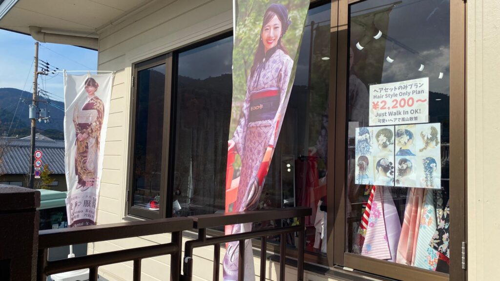阪急嵐山駅から徒歩11分、嵐電嵐山駅からは徒歩3分。観光地の中心にありながら、少し落ち着いた場所に店を構える「嵐山着物レンタル 愛和服」は、ゆったりと支度ができるレンタル着物店です。賑わいの只中に飛び込む前に、心を整える時間が持てるのが嬉しいところ。
