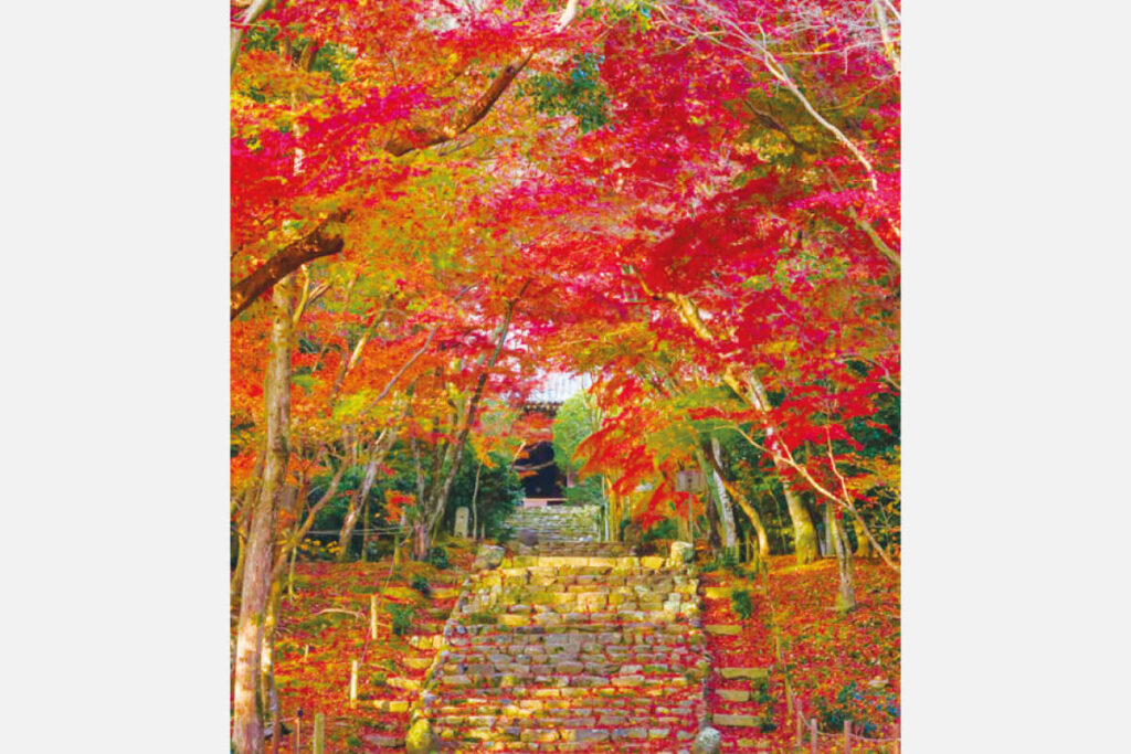 例年11月中旬~12月初旬が見頃。石畳の参道のカエデや銀杏のほか、紅葉のトンネル、終盤の本堂裏に散る紅葉のじゅうたんも見事。