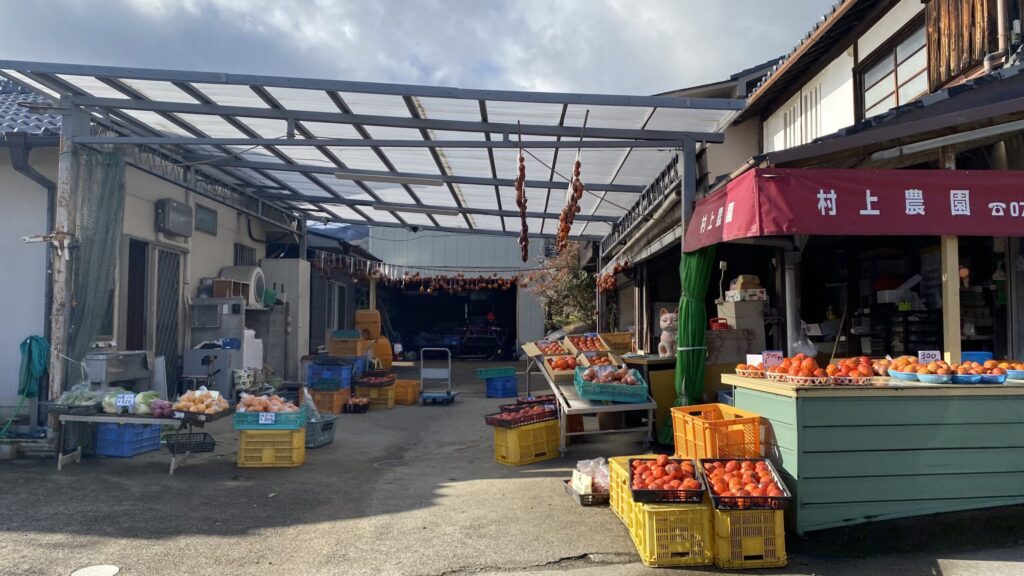京都・大原野の自然に囲まれた村上農園は、地元の人々や遠方から訪れる人にも親しまれる直売所です。ここでは、四季折々の旬の野菜を中心に、秋から冬にかけては柿、春には筍を販売しています。農園の前に立つだけで、日常を忘れ、自然と季節の移ろいを感じられる特別な場所です。