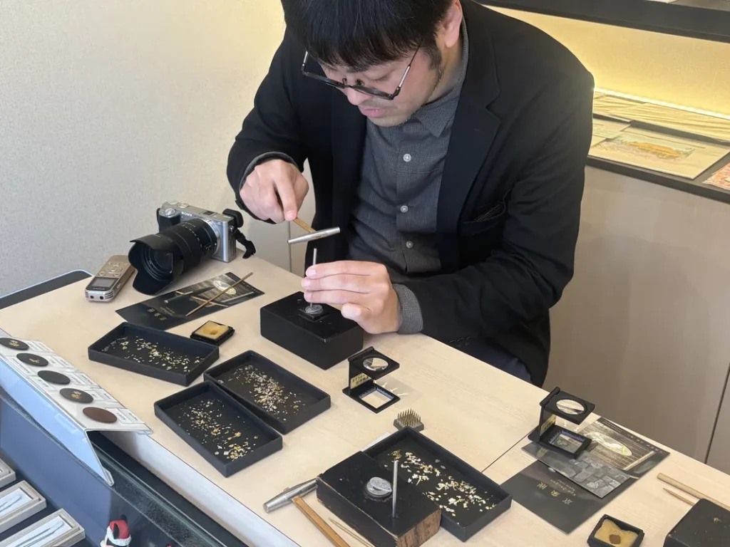 実際に体験できるのは「入嵌(にゅうがん)」の作業です。小さな鉄の地金に純金・純銀の動物や植物などをあしらい、自分だけのオリジナル作品を作りあげることができます。