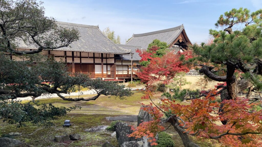 同じ部屋には、応仁の乱以前の周辺寺院の地図が常設展示されており、かつて多くの寺が立ち並んでいた様子を知ることができます。庭園には多種多様な木々が植えられ、樹齢400年の木もあると教えていただきました。スタッフの方が実際に年輪を数えたというエピソードも印象的でした。