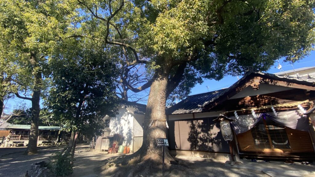 境内には、樹齢130年ほどといわれる大きなクスノキが立っています。その堂々とした姿と生命力に圧倒され、思わず足を止めました。このクスノキは京都市指定保存木にもなっており、長い年月をかけて守られてきた存在です。木の前に立つと、時間の重なりを肌で感じるようでした。