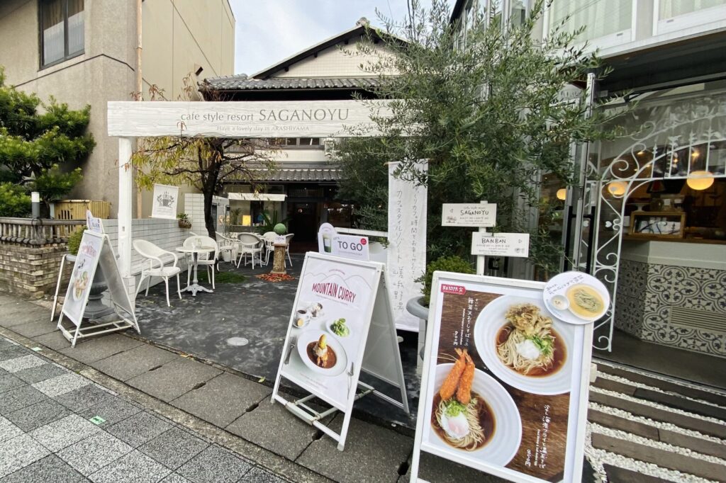 嵯峨嵐山の街並みを散策していると、ふと目を引く白を基調としたお洒落なカフェがありました。「カフェスタイルリゾート嵯峨野湯 (Cafe Style Resort SAGANOYU)」です。店内に一歩足を踏み入れると、リゾート地に来たかのような上品で清潔感のある空間が広がり、心地よい時間が流れます。まるで日常から少し離れた贅沢なひとときを過ごしているような気分になりました。