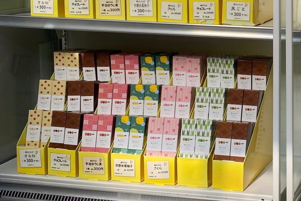 なかでも目を引くのが「串わらび」。串に刺さったわらび餅という可愛らしい見た目に加え、宇治ほうじ茶や京都水尾柚子、黒ごま、きな粉、チョコレートなど味のバリエーションも豊富。ひとつずつ手に取りながら、誰に贈ろうかと考える時間まで楽しくなります。