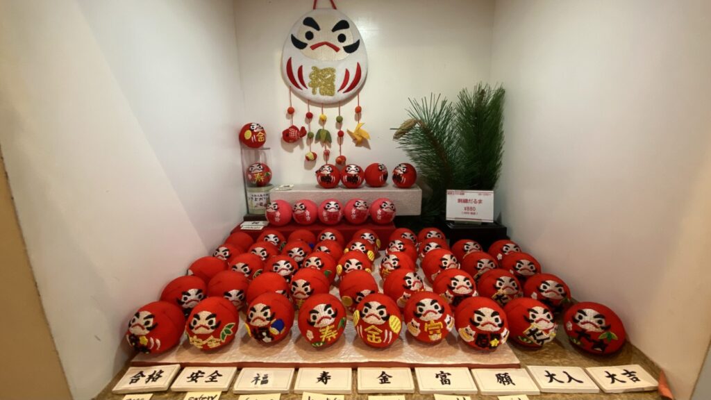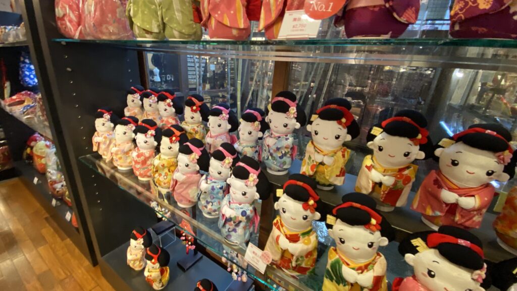 ご利益がありそうな刺繍だるまも種類が多く、合格祈願、福、寿、大吉など、贈り物にもぴったり。もちろん京都らしい舞妓さんのちりめん人形も並んでいます。