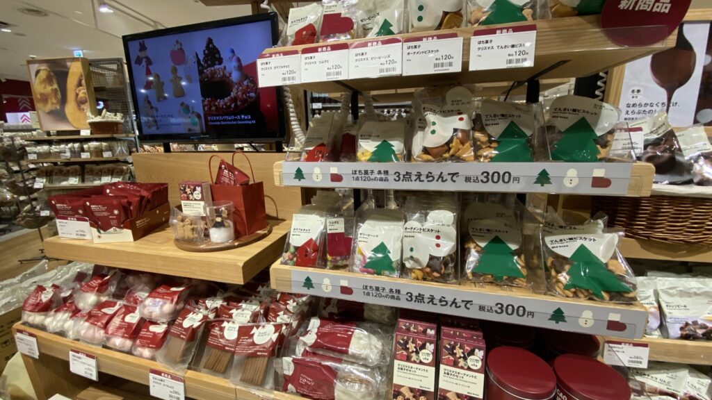 最近はお店の方にラッピングまでお願いしてしまうことが多かったのですが、少し手を加えるだけで、相手を思いながら準備する温かい時間になるのだと改めて実感しました。ほかにも、クリスマスパッケージのお菓子や、つい選んでしまう3つで300円のおやつシリーズ、さらには夢のような“お菓子のお家”キットまで揃っていて、見ているだけで気持ちが弾みました。