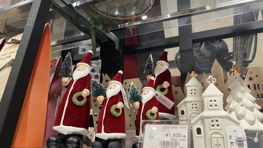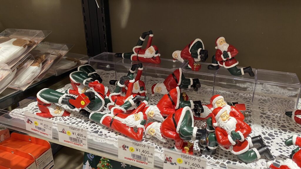ハンプティーダンプティーさんでも、思わず足を止めてしまうような可愛らしいクリスマスグッズを見つけました。中でもサンタさんの置物は、見た瞬間にクスッと笑ってしまうほどユーモアたっぷり。足を高くあげていたり、まるでストレッチをしているようだったりと、どれも表情豊かでユニークなポーズばかり。もしかするとダンスの途中なのかもしれません。こんな楽しいサンタさんは初めてで、ぜひ手に取ってじっくり眺めてほしくなる可愛らしさでした。