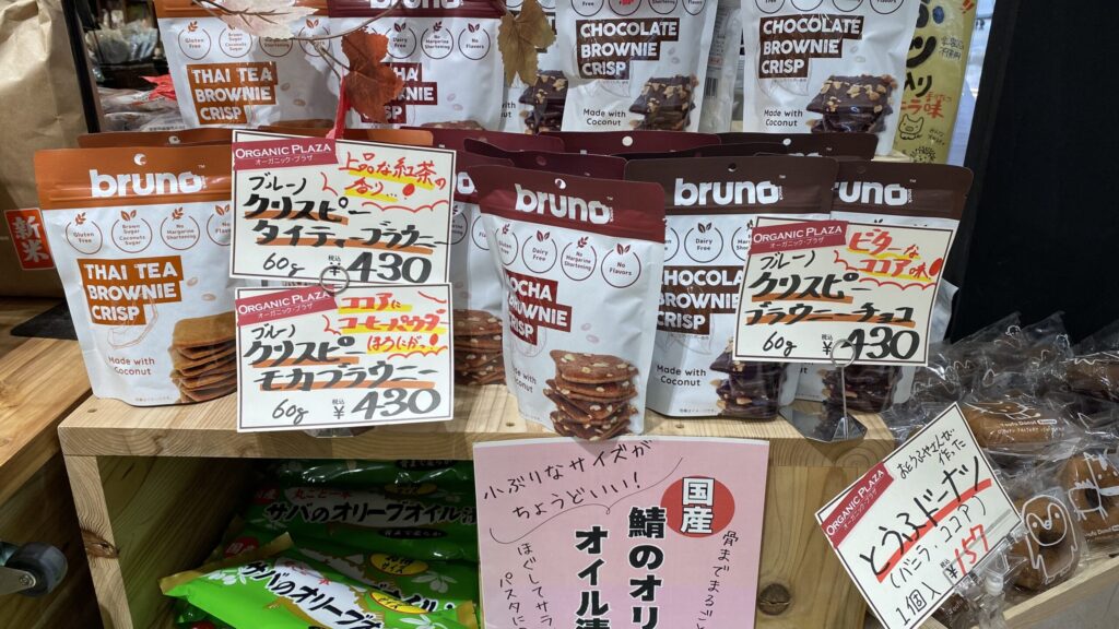 オーガニックプラザでは、その他にも無添加のお菓子やこだわりの調味料など、日常の食卓を少し特別にするアイテムが豊富に揃っています。週末には小さなお子様連れの家族も多く、オーガニックお菓子を手に楽しそうに買い物する姿が見られます。訪れるたびに新しい発見があり、日常の買い物がちょっと特別な時間に変わるのも魅力です。