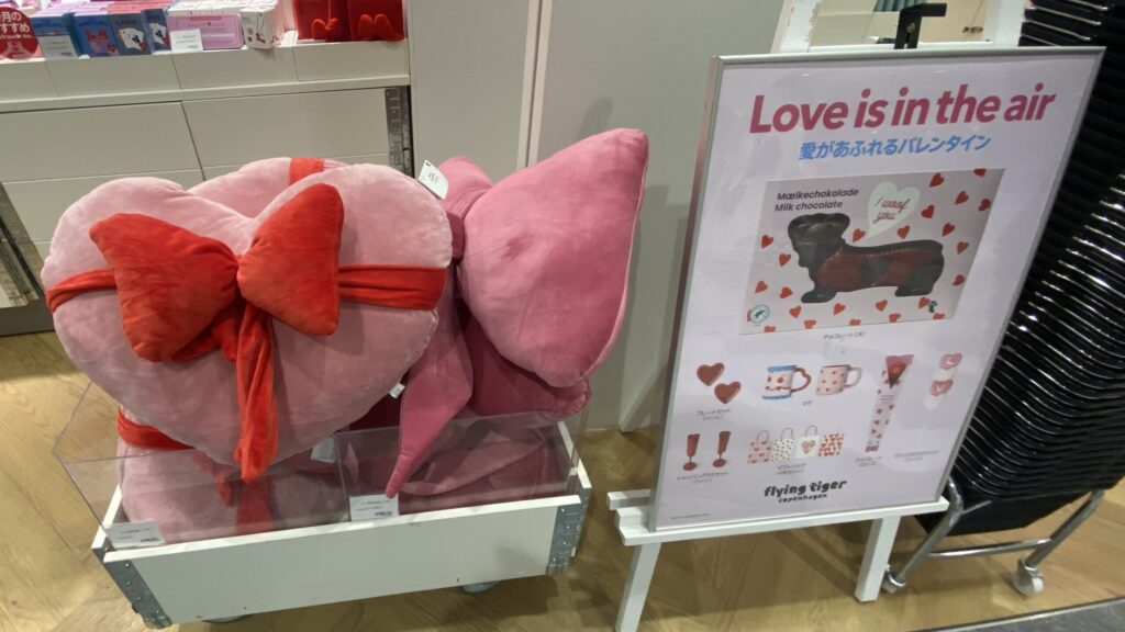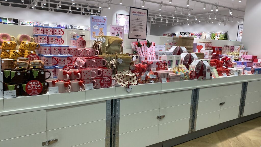現在はバレンタイン期間限定の商品が展開されており、売り場にはハートモチーフのアイテムが豊富に揃っています。甘くなりすぎないデザインが多く、贈り物としても、自分用としても手に取りやすい印象を受けます。