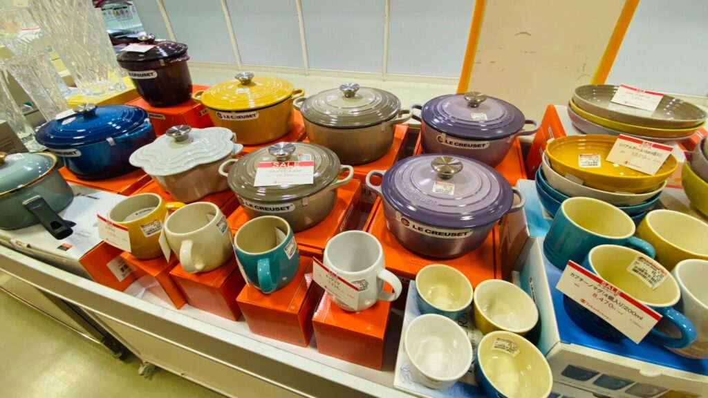 阪急桂駅からバスでアクセスできる洛西高島屋の3階。桂・嵐山エリアで唯一、ル・クルーゼの食器を実際に手に取って選べる貴重な売り場があります。ゆったりとしたフロアで色とりどりの器を見比べられるのが魅力です。