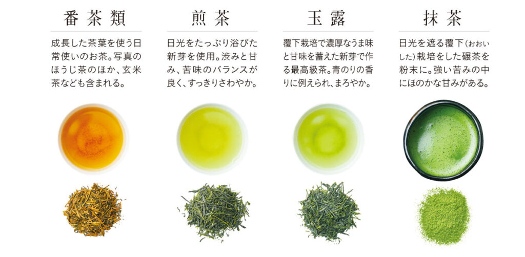 お茶と聞くと多彩な種類が浮かぶが、味は違えど原料はどれも同じチャノキの葉。伊藤さんによると発酵の度合いで、緑茶・ウーロン茶・紅茶に大別されるのだそう。日本で造られるお茶のほとんどは不発酵茶である「緑茶」で、さらに碾茶(てんちゃ)(抹茶の原料)・玉露・煎茶・番茶類の4つに大きく分類される。