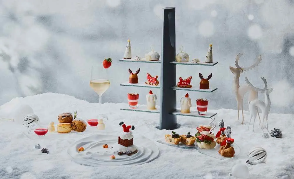 クリスマスは通常よりも食材やデコレーションにより華やかさをプラスしてお届け。ピエール・エルメ・パリの季節を彩るケーキやスコーンに加え、ザ・リッツ・カールトン京都のシェフが腕によりをかけて作る、地元産の旬の食材をふんだんに使ったセイボリーが楽しめる。