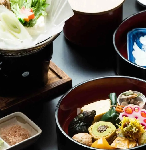 茶屋旅荘の面影が残る豆腐料理の名店・豆屋源蔵では、ランチ、ディナーともに豆腐をふんだんに使った多彩なメニューを楽しめる。食事からスイーツまで、名店ならでは豊富なラインアップの豆腐を堪能してみては。繊細に仕立てられた京料理を、京都の夏の風物詩・納涼床でぜひ。