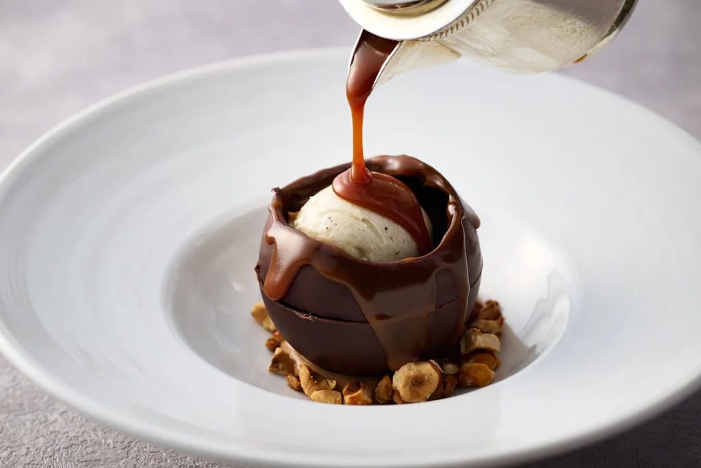 目の前で熱々のキャラメルソースをかけるとドームが溶け出し、中から冷たいアイスと秋の果実が姿を現します。熱々ショコラとひんやり濃厚なトリュフアイスの絶妙なハーモニーを感じられる一皿となっています。