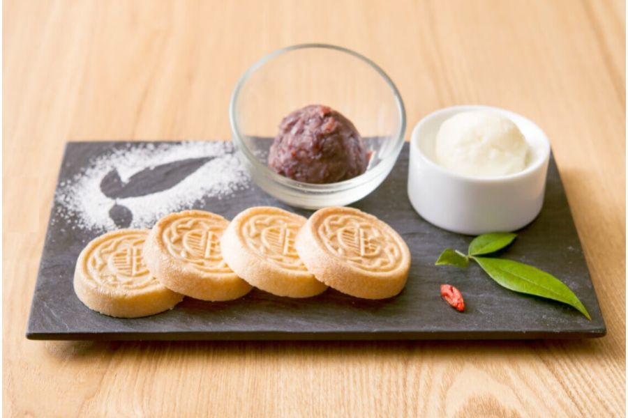 「あのん」看板商品である「あんぽーね」(現在「あんぽーね」は「三宝菓」1,320円のセット内でのみ提供)をいただくこともできます。羽二重うるち米を使ったサックリ歯切れのよい香ばしい最中皮に、十勝産あんことマスカルポーネを使った自家製クリームを自分でサンドする絶品最中です。
