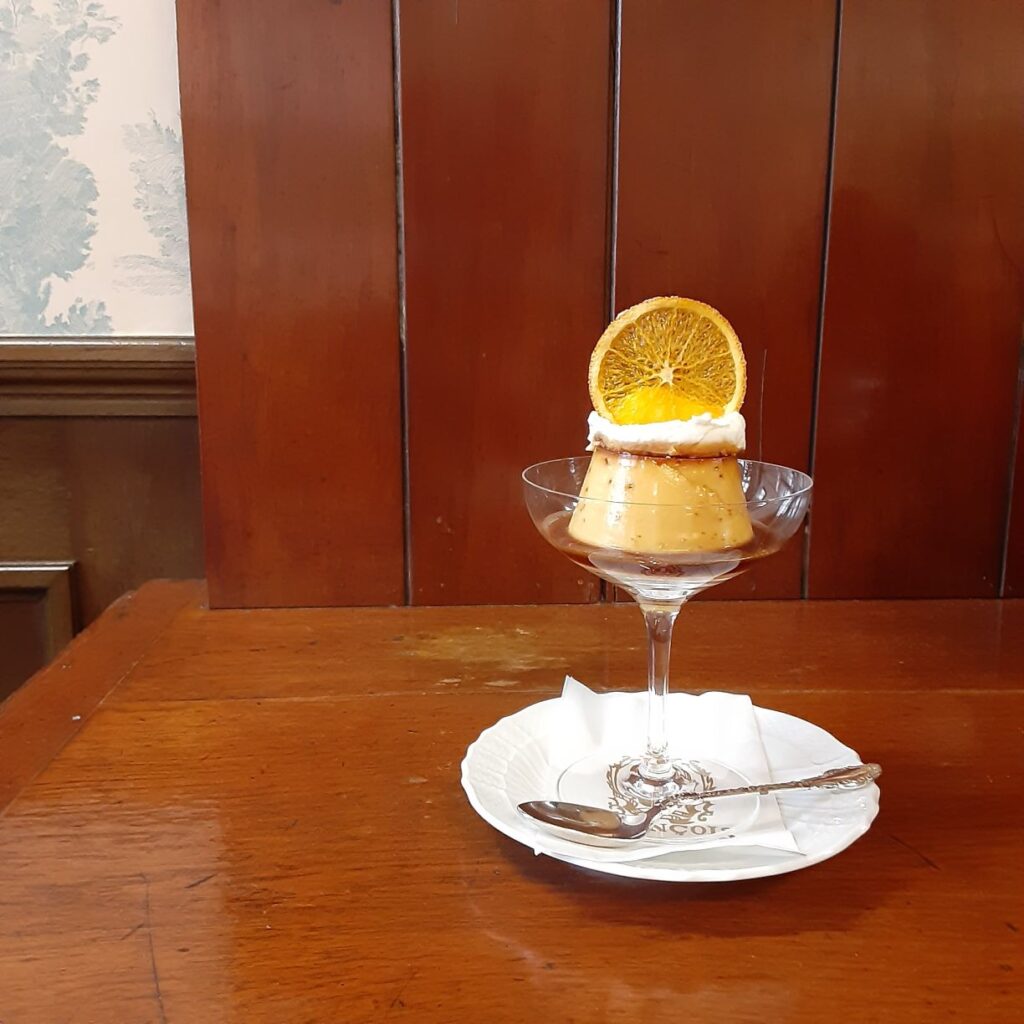 また、最近レギュラーメニューとなった「特製プリン」750円も人気の一品。細い脚のグラスで提供され、ドライオレンジが添えられた美しいビジュアルにもキュンとする、ほろ苦いカラメルが魅力的な大人のデザートです。