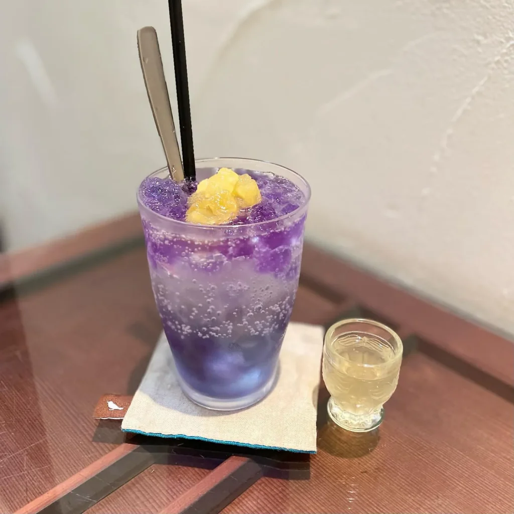 ドリンクメニューも楽しみです。 cafe marble(カフェマーブル) 仏光寺店 限定のバタフライピーティーソーダはいかがでしょう?パインジャムとバタフライピージュレがたっぷりの爽やかな青色のティーソーダ。魔法のシロップをかけると、色の変化が楽しめます。