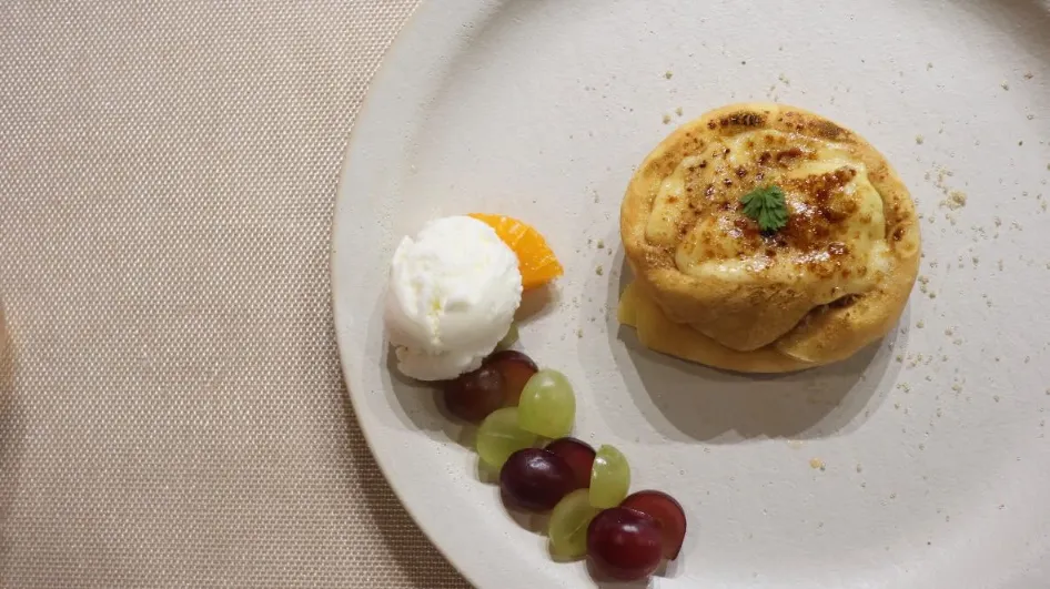 季節のフルーツと自家製の甘さ控えめのカスタードクリームをたっぷり使ったクレームブリュレもおすすめです。フルーツはその時どきで変わるのも楽しみです。