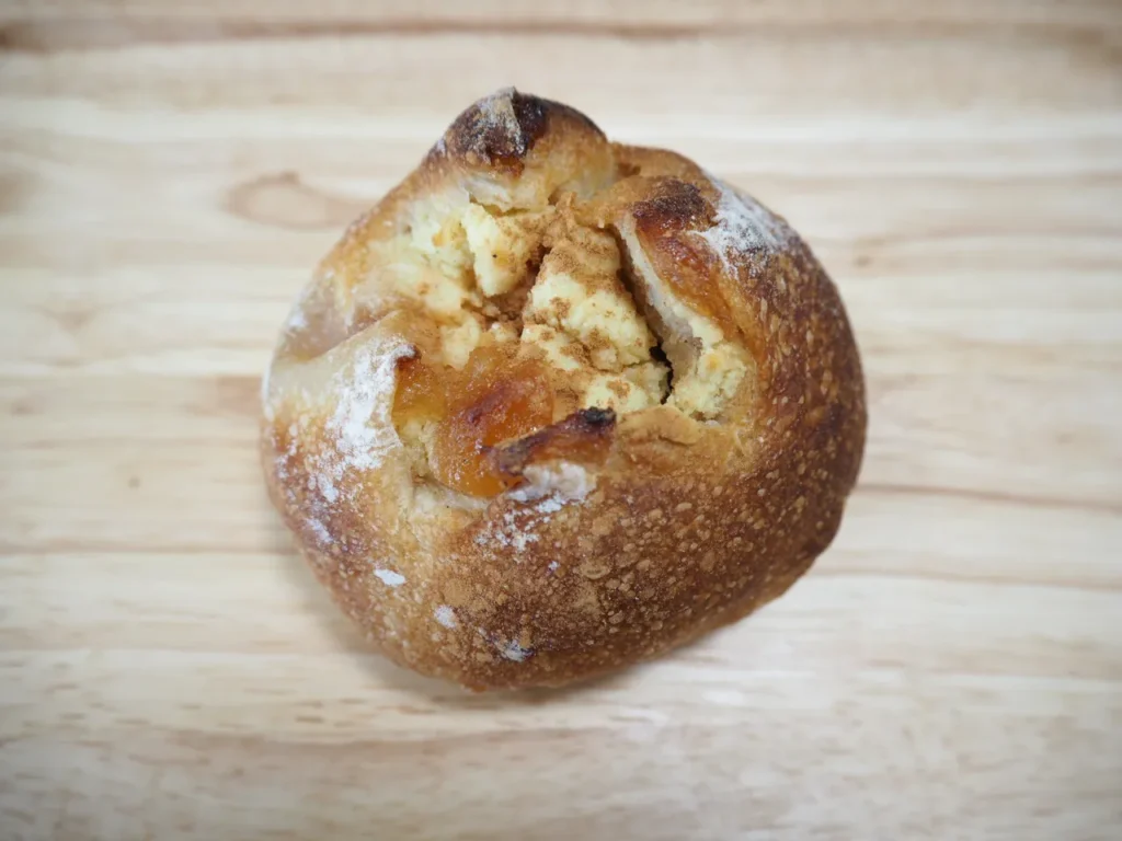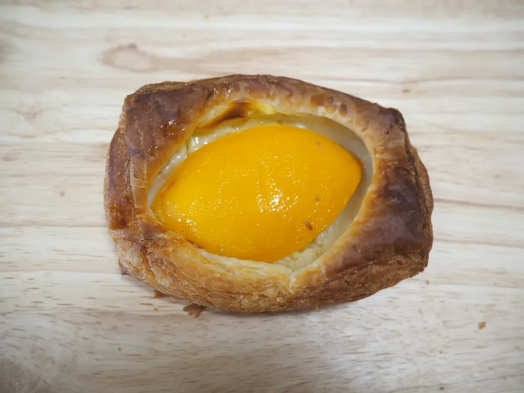 特徴: デニッシュ生地にクレームダマンドを絞って黄桃を乗せ焼いた一品です。