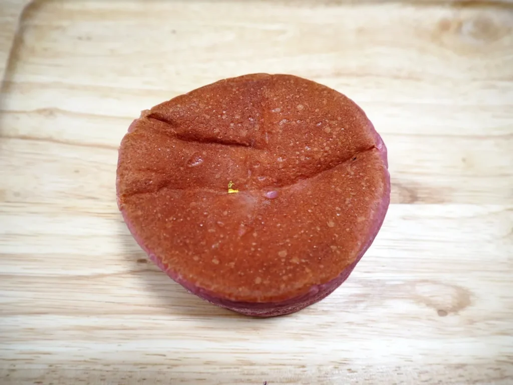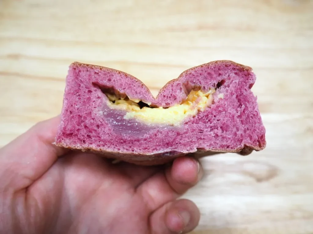 特徴: 紫芋の生地に紫芋あんとブランデー漬けのリンゴ、カスタードクリームとお酒の効いた大人向けのパンです。