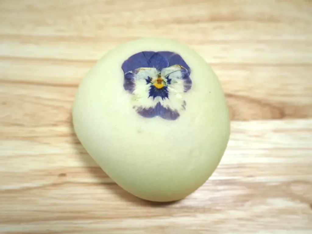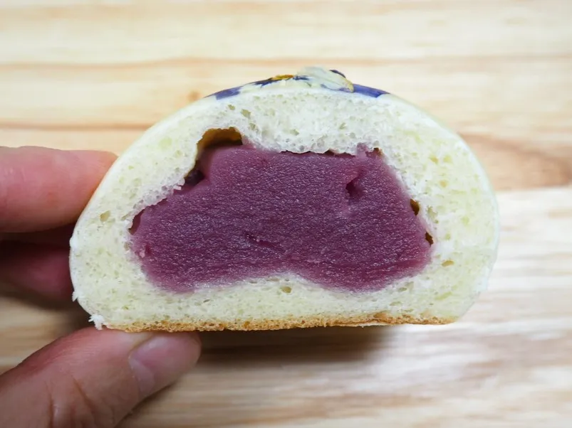 特徴: 白ぱんに紫芋あんを包み焼いてスミレの花びらを乗せた上品なパンです。