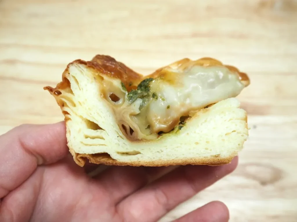 特徴: 餃子とチーズを乗せ焼いたパイ。バジルの風味がさわやかなアクセントになっています。