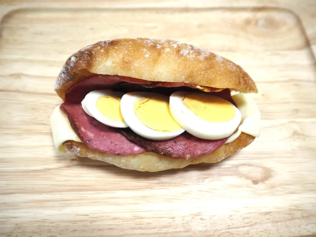 特徴: やわらかいパンにゆで卵とハムをサンドしたシンプルなパン。朝食にいいですね。