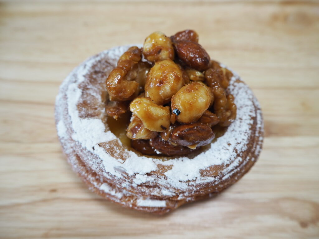 カスタードクリームの入ったデニッシュ記事に、キャラメリゼしたナッツがゴロゴロ。