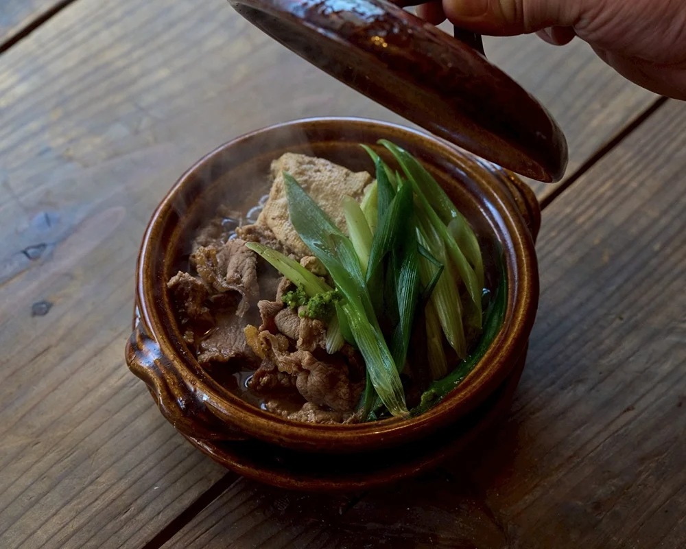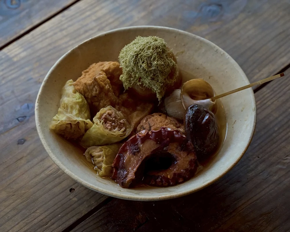 夜は、自家製豆腐が主役に据えられ、おでん料理や囲炉裏料理が楽しめます。おでんは昆布の出汁が効いたやさしい味わいで、豆腐や厚揚げ、がんもどきといった大豆素材を中心に、大根やこんにゃくなどの王道具材も揃い、一品料理も充実しています。