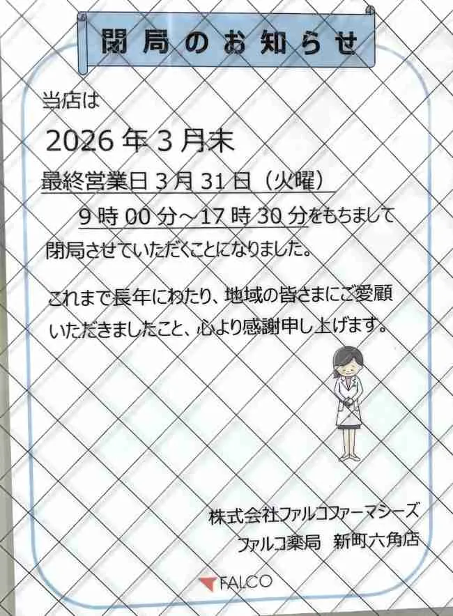 この廃院に伴い、病院のすぐ目の前にある「ファルコ薬局 新町六角店」も、同じく2026年3月31日(火)をもって閉局します。最終営業日は17時30分で業務を終了する予定です。